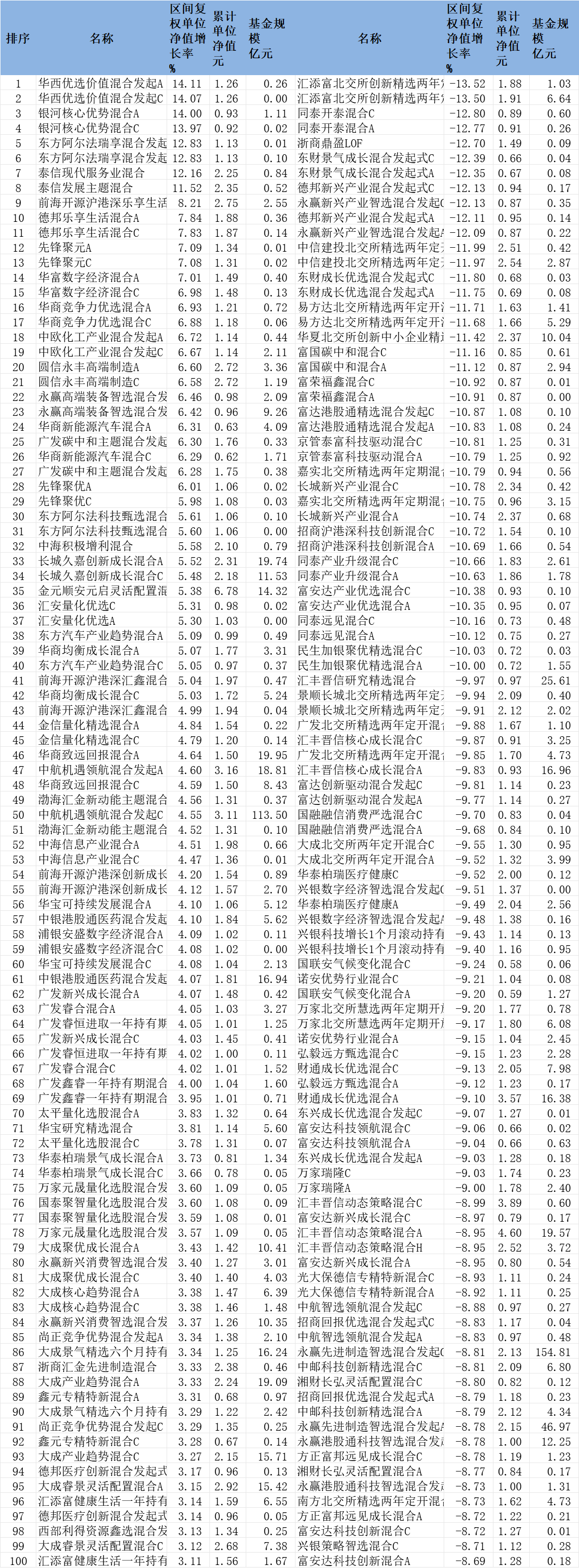 中国经济网北京12月2日电(记者何晓)今年11月,市场业绩可比的8716只混合型基金(各类股票单独计算,下同)中,资产净值增加的有1276只,占比14.6%。 7,413只基金净值下跌,其余27只基金净值持平。 11月份共有8只混合型基金涨幅超过10%(含10%),其中华西优选价值混合启动A、华西优选价值混合启动C领涨,回报率分别为14.11%和14.07%。华西混合优先价值计划A于2023年11月9日成立,华西优先价值混合计划C于2025年9月15日成立。截至2025年11月28日,本年度华西优选价值混合计划A回报率为26.78%,西部优选价值混合计划回报率为26.78%。空调成立以来分别为25.94%和11.87%,累计净额分别为1.2594元和1.2592元。三季报显示,报告期内该基金继续重点深化科技增长板块。截至今年9月30日,公司持股前10名分别为国航、东方财富、华虹半导体、融时科技、绿城中国、希望电气、华海药业、南方航空、创新科技、远东生物。该基金现任管理人为李本刚。李本刚先生现任西南证券股份有限公司、中关村证券股份有限公司、建信基金管理有限公司、大成基金管理有限公司研究员、基金经理、价值组董事、股权配置投资总监现任大成基金管理有限公司总经理、珠海新阳投资管理合伙企业(有限合伙)执行合伙人。协会)。在月涨幅超过10%的8只混合型基金(含10%)中,今年截至9月30日规模超亿元的一只是银河核心优势混合A,据悉银河核心优势混合A月度涨幅为14.00%。成立于2022年7月22日,截至今年9月30日规模为1.11亿元。截至2025年11月28日,本年收益率为33.88%,成立以来收益率为-6.63%,累计净值0.9337元。 2025年第三季度,Galaxy Core Advantage Mix A仓位保持基本平衡水平,仓位构成主要根据市场波动进行调整。截至九月今年第30名,公司持股前十大分别为麦威、海博智强、亿纬锂能、阳光电源、希望电气、宁德时代、海利风电、永鼎、艾克赛博和英维克。该基金现任基金经理为李一凡先生。李一凡先生曾任浙江省财政局信息中心职员。 2012年4月加入银河基金管理有限公司研究部,现任银河核心优势混合型证券投资基金股权投资部基金经理、基金经理。与此同时,共有11只混合型基金11月份跌幅超过12%。其中,中国国际资本交易所北交所创新精选2年定开组合C、汇添富北京交易所北交所创新精选2年定开组合A排名垫底,收益率分别为-13.52%和-13.50%。中国国际资本交易所2年固定开放式混合空调入选或京汇创新由基金经理马翔Es管理。马翔于2011年加入汇添富基金管理有限公司,担任行业分析师。 2025年11月前100名混合基金数据来源:Flash(规模截止日期:2025年9月30日)